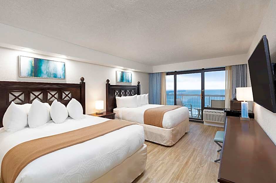 The Double Oceanfront Guestroom features two double beds, a full bathroom with tub/shower combination, mini refrigerator, coffee maker, cable television and a balcony view with full ocean view.